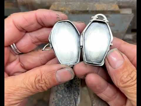 A coffin locket! It’s all sterling silver and I cut the coffin myself from Aurora Opal, which is man made. Be sure to watch the video to see it in action! It measures about 1 5/8” tall, including the bail but not the jump rings and comes on a 22” sterling chain. If you’d prefer a shorter chain just email me right after purchasing with the length you’d like and I’ll shorten it for you. This will ship via priority mail insured within the US, first class insured to Canada Australia and New Zealand.
