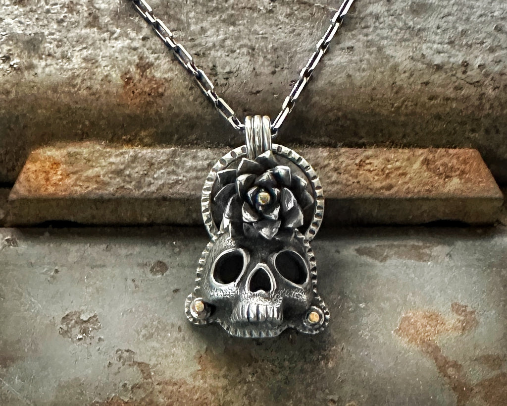 A sterling silver skull with a large flower with a 14k dot and 14k earrings. The skull itself was cast from my original carving so you won’t find it anywhere else! She comes on a 22” oxidized sterling chain and measures about 1 1/4” tall, including the bail but not the jump rings. If you’d prefer a shorter chain. Email me right after purchasing with the length you’d like and I’ll change it for you. Please note that I’m shipping within the US, Canada and Australia only at this time.