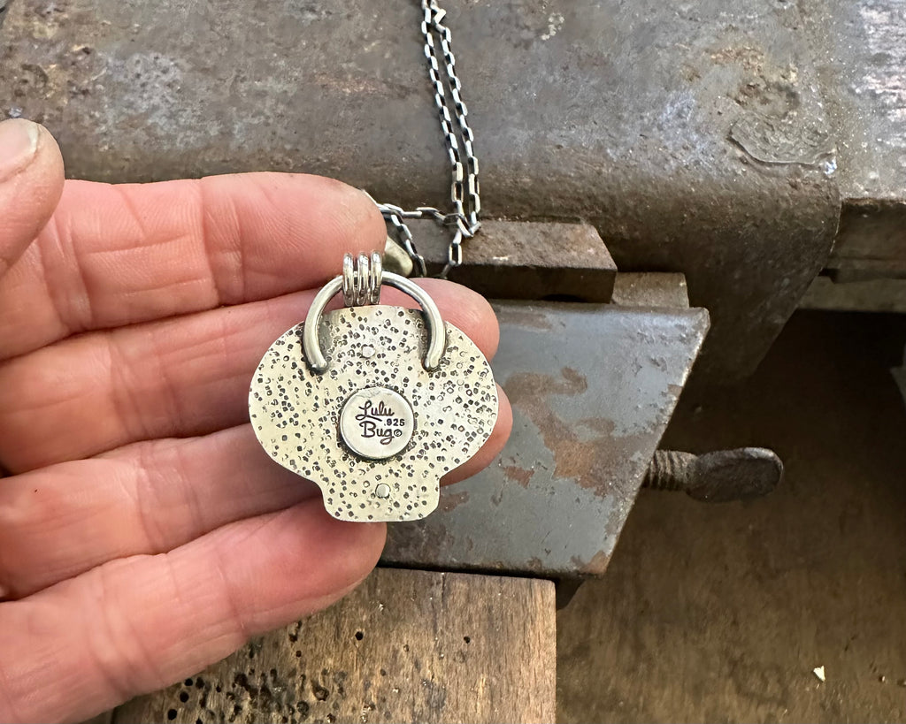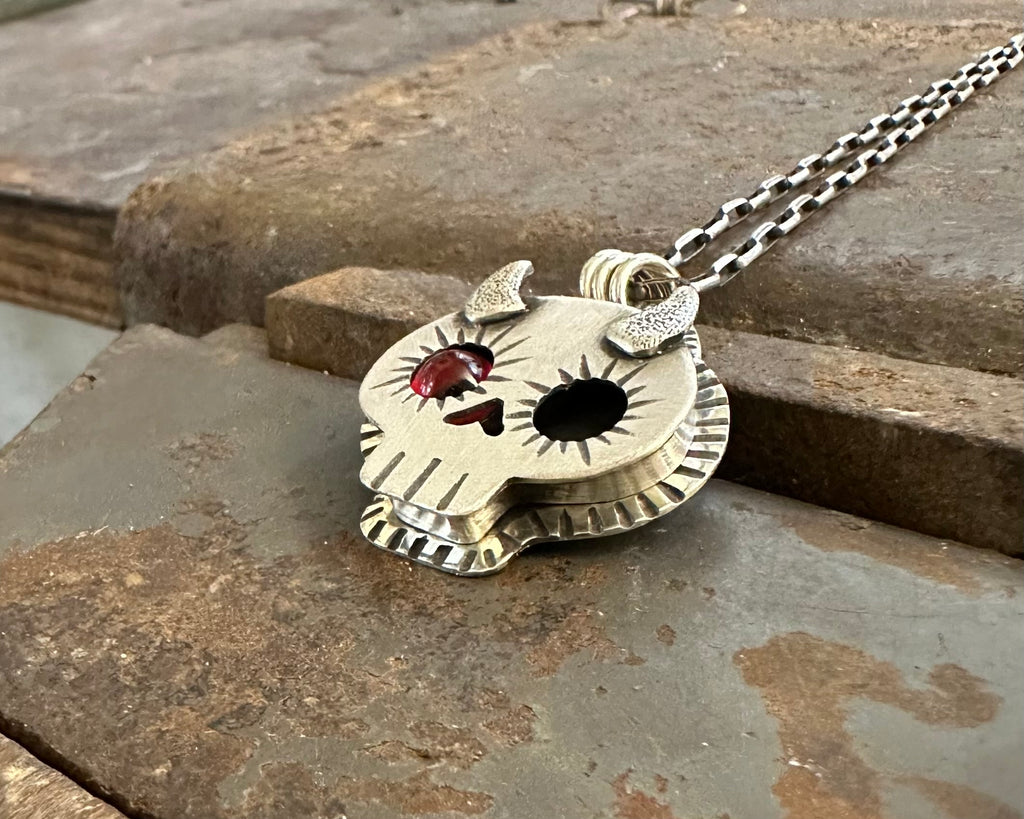 A cute little wonky eye diablito skully! All sterling silver with a glass eye. She comes on a 22” oxidized sterling chain and measures about 1 1/4” tall, including the bail but not the jump rings. If you’d prefer a shorter chain. Email me right after purchasing with the length you’d like and I’ll change it for you. Please note that I’m shipping within the US, Canada and Australia only at this time.