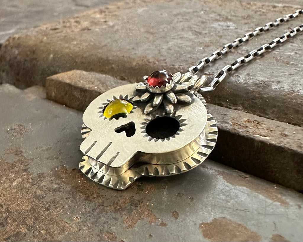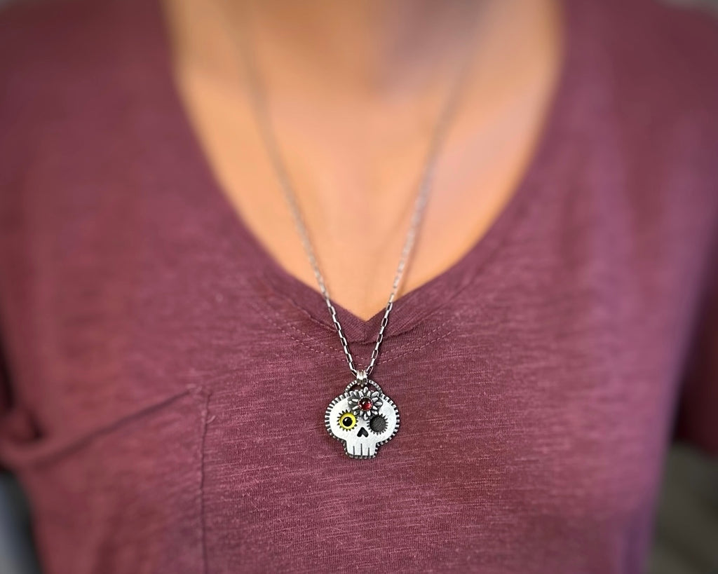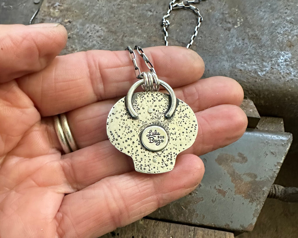 A cute little wonky eye skully! All sterling silver with a glass eye and a 4mm garnet. She comes on a 22” oxidized sterling chain and measures about 1 1/4” tall, including the bail but not the jump rings. If you’d prefer a shorter chain. Email me right after purchasing with the length you’d like and I’ll change it for you. Please note that I’m shipping within the US, Canada and Australia only at this time.