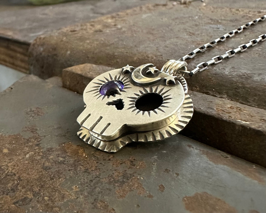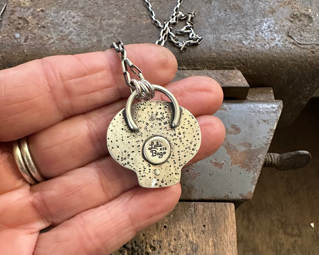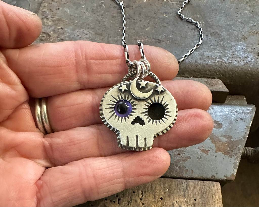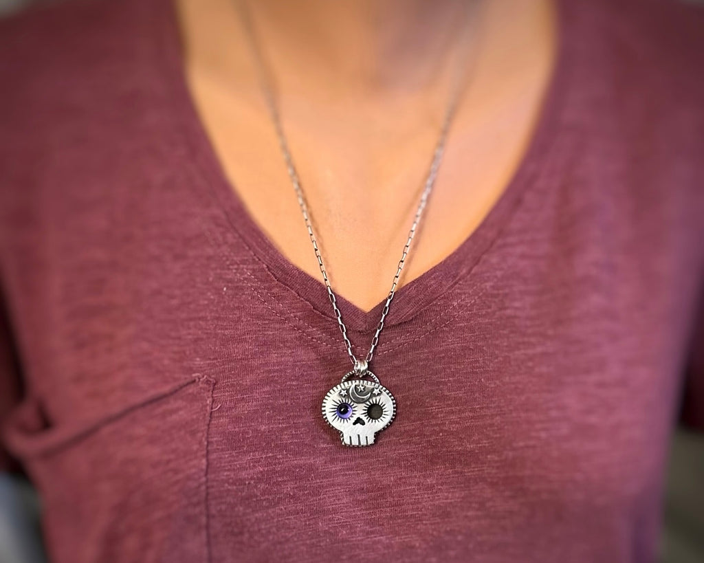 A cute little wonky eye skully! All sterling silver with a glass eye. She comes on a 22” oxidized sterling chain and measures about 1 1/4” tall, including the bail but not the jump rings. If you’d prefer a shorter chain. Email me right after purchasing with the length you’d like and I’ll change it for you. Please note that I’m shipping within the US, Canada and Australia only at this time.
